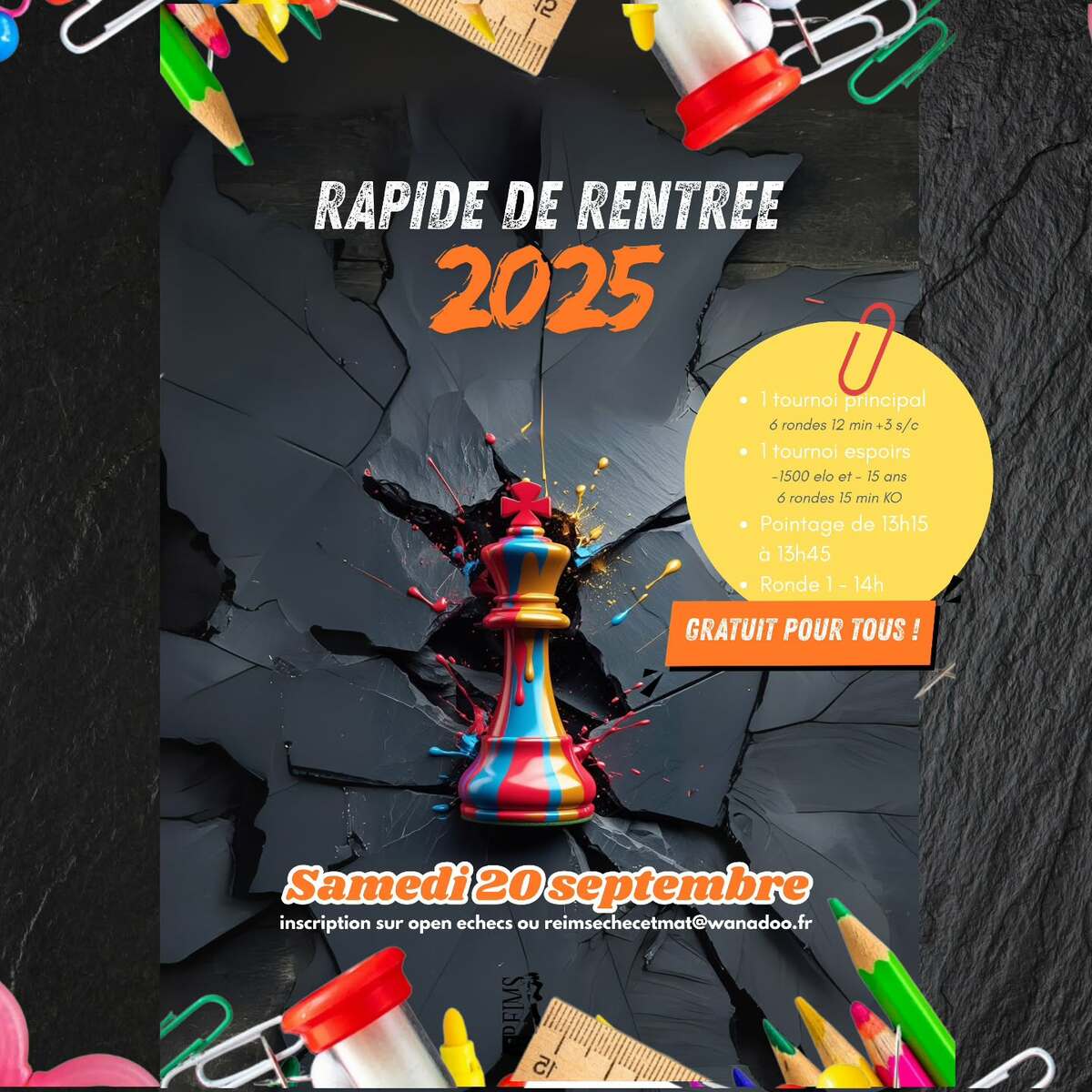 Inscriptions sur : http://inscrit.open.free.fr/ ou par mail : reimsechecetmat@wanadoo.fr - en indiquant Nom prénom date de naissance ou bien en donnant son n° licence