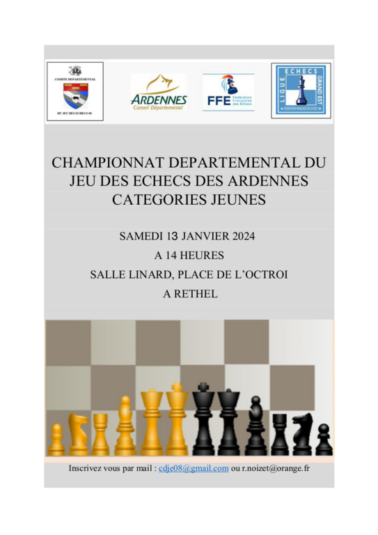 La nouvelle équipe du comité des Ardennes en collaboration avec le club d’échecs de Rethel réitère le championnat individuel des Ardennes jeunes qui fût l'année dernière un vrai succès.
